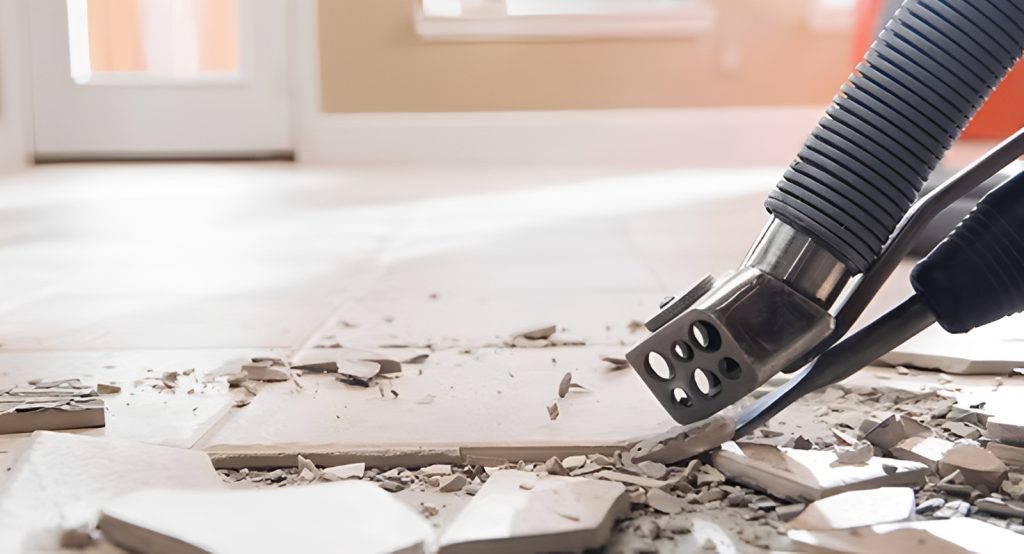 HEPA-filtered vacuums installed before tile removal begins